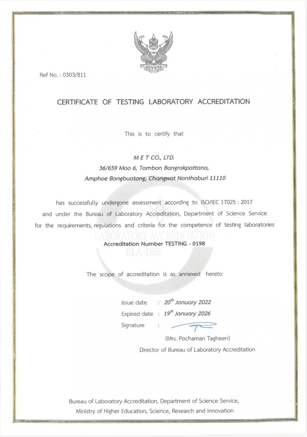 ห้องปฏิบัติการทดสอบ บริษัท เอ็ม อี ที จำกัด ได้รับการรับรองมาตรฐาน ISO/IEC 17025 : 2017 จากกรมวิทยาศาสตร์บริการเป็นที่เรียบร้อยแล้ว